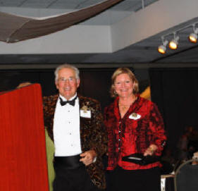| Judges Shelly Coburn, Jim Busch, and Jenny Hawthorne (from NewZeland) with All Star Review winner Ch. Boulder's Power of Persuasion, CD,RE,VC,MH "Suede" with owner Judy Hetkowski from Boulder, CO. | Jim and Linda Busch accepting gift at Honored Guests reception for 2010 Vizsla Club of America national event (Oct. 2010) in Oconomowoc, Wisconsin. |