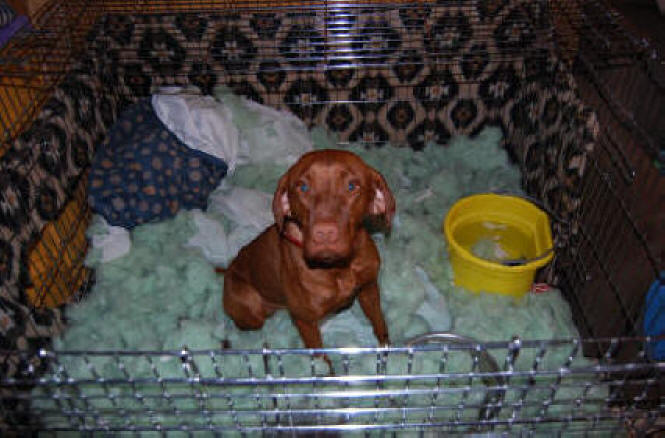 | Linda's female ZEEVA FINISHED HER SHOW CHAMPIONSHIP MAY 7TH BY EARNING A 4 POINT MAJOR AT THE BADGER K.C. SHOW IN WISCONSIN. YEAAA!!! (Kacela X Ch. Archiee, JH) | Zeeva decided to celebrate her big wins by making green clouds out of her doggie bed. "What? You don't like my clouds?" |